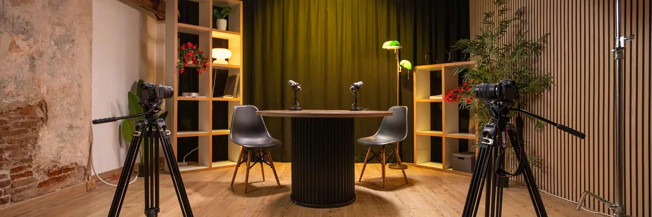 Contamos con varios sets de grabación y ambientes que permiten crear atmósferas variadas: desde espacios más sobrios y profesionales hasta entornos más cálidos, creativos o informales. Esto nos permite adaptarnos tanto a podcasts corporativos como a proyectos personales, divulgativos o de marca.